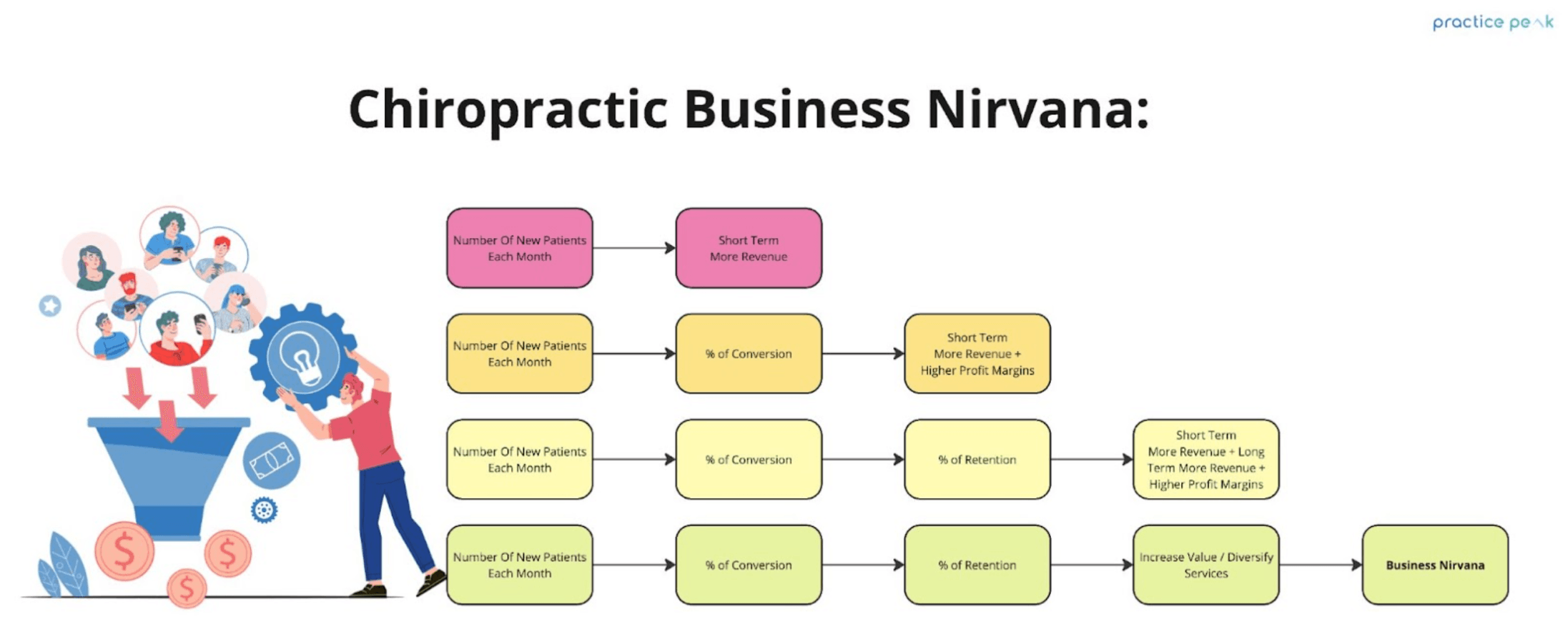 Now, let’s pivot to a different approach—one that doesn’t just fill up your appointment book today but builds a business that can weather any storm and continue to grow. This is the path to Chiropractic Business Nirvana.